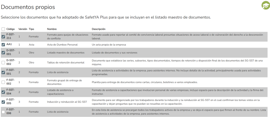 Seleccione los documentos adoptados de SafetYA Plus que desea incorporar al Listado Maestro de Documentos. Este listado constituye la integración de los documentos de SafetYA con los propios de la empresa. En esta sección debe indicar cuáles documentos se desplegarán al momento de realizar consultas, con el fin de facilitar la obtención de evidencias y evitar la aparición de documentos que no resulten relevantes para la organización.